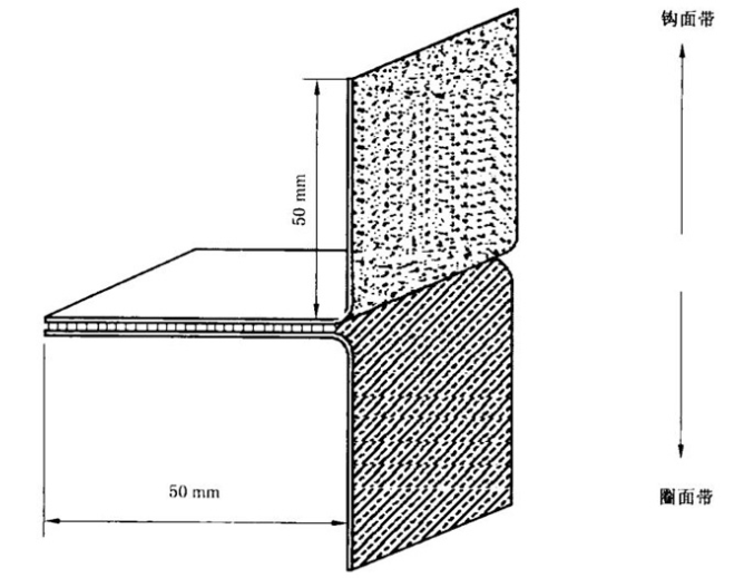 b.将钩面带垢面朝上放在平台上,圈面带毛面朝下放在钩面带上,使钩面带和圈面带两端错开,沿长边方向轻轻压合,并使其有效宽度为50mm(如下图)