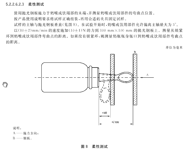 新增了奶嘴的柔韧度测试是在100mm*100mm的钢板上以10mm/min的速度施加10N的力值,测量从锁紧环到弯曲点的距离。