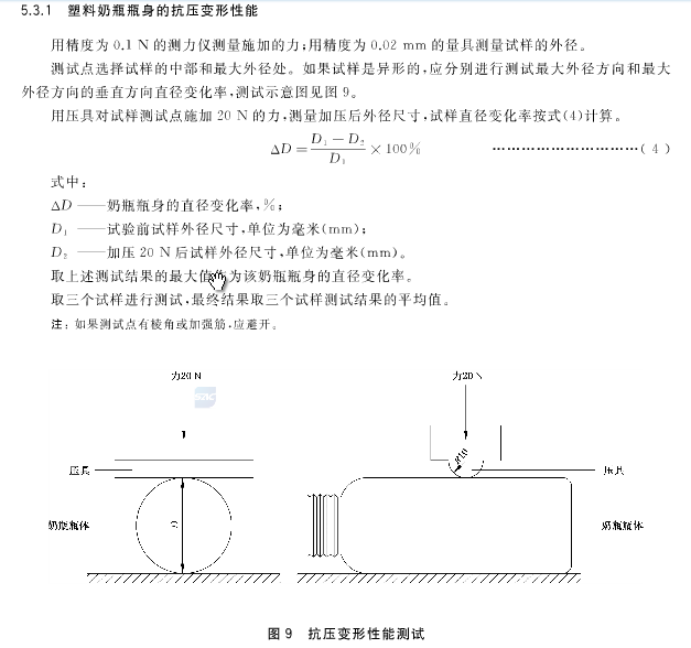 奶瓶的抗压性能测试是在试样的中部和最大外径处施加一个20N的力值,测量加压后外径的尺寸