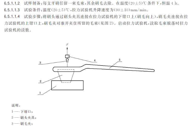 GB39669-2020 牙刷及口腔器具安全通用技术要求,该标准规定了毛束的拉力和颈部抗弯力的试验方法。推荐使用我公司出品的一块小力值拉力试验机,符合国家标准以及行业标准。该标准要求如下